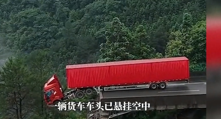 红色卡车车头冲出断裂桥面7米多远,下方是30多米深的沟壑,驾驶室里的游国春屏住呼吸,生怕稍重的喘息会成为压垮车辆的最后一根稻草。